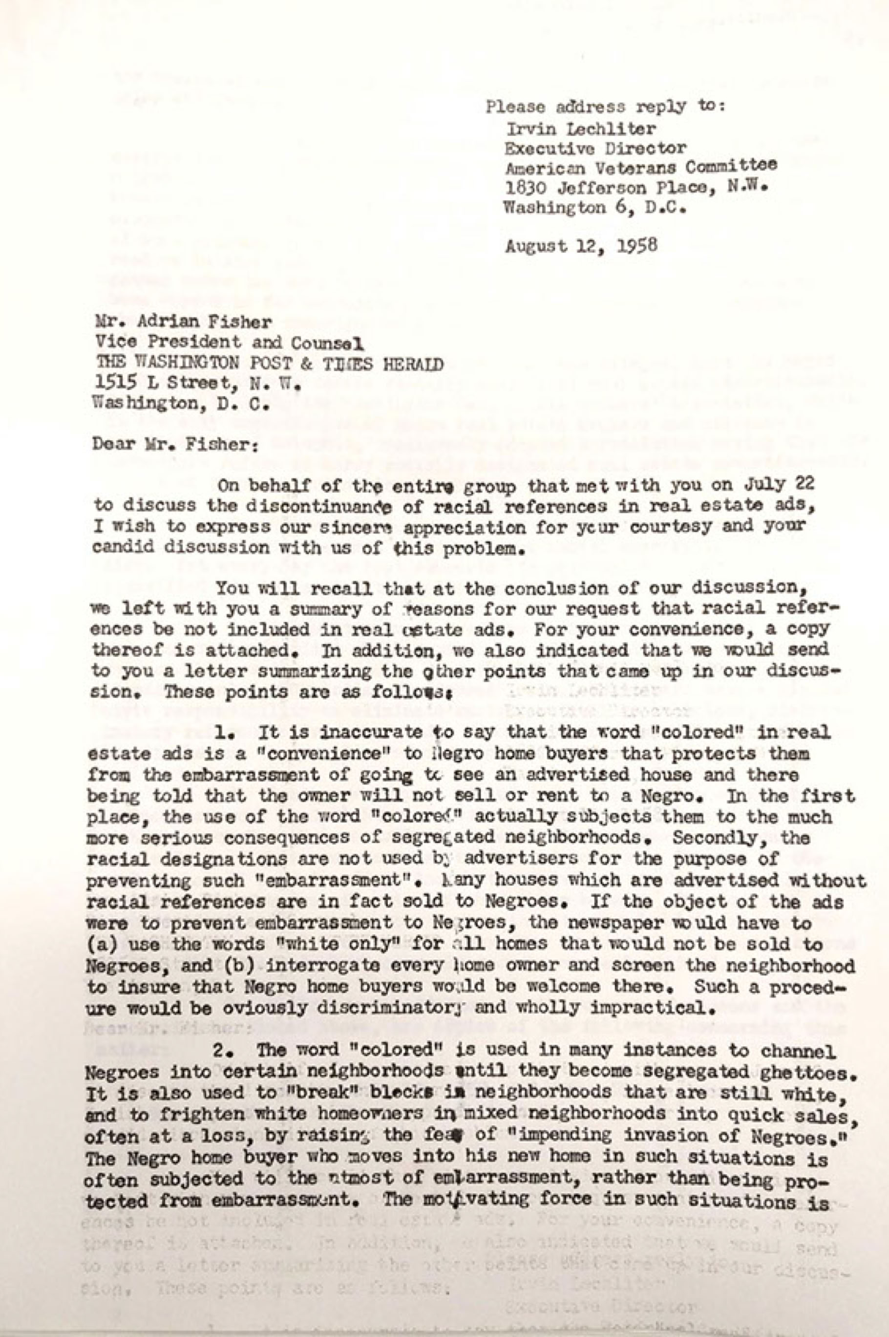 The American Veterans Committee worked to eliminate racial language in newspaper housing ads. DC's daily papers quietly adopted this policy in 1960.