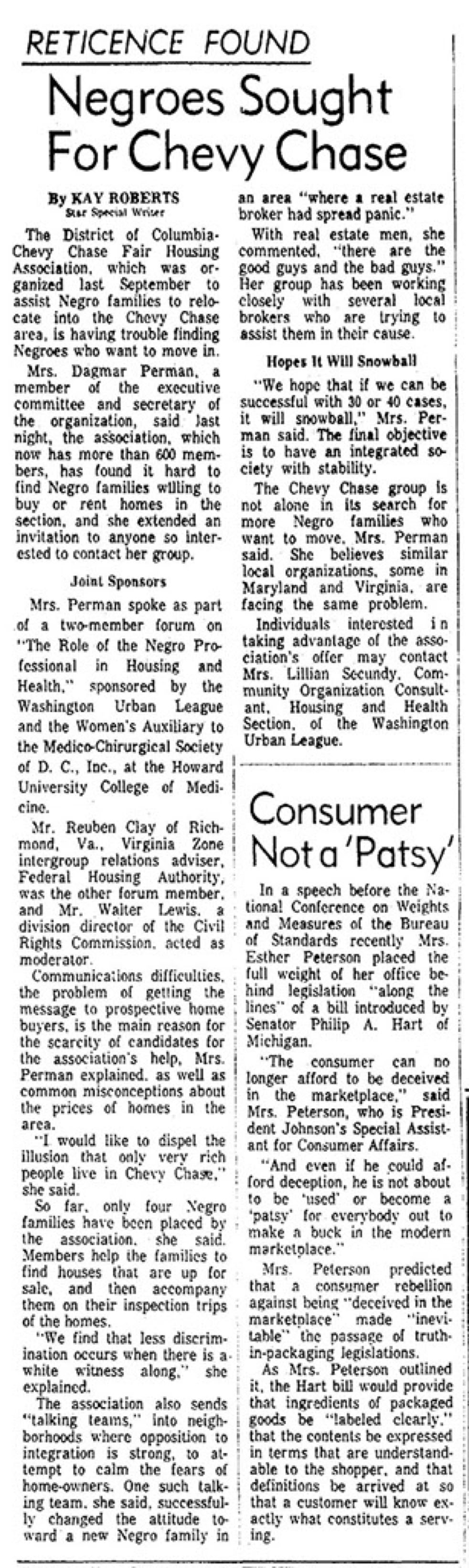 A local fair housing group whose mission was to help black families move to the historically white Chevy Chase neighborhood west of Rock Creek Park "is having trouble finding Negroes who want to move in," the Evening Star reported in June 1964.