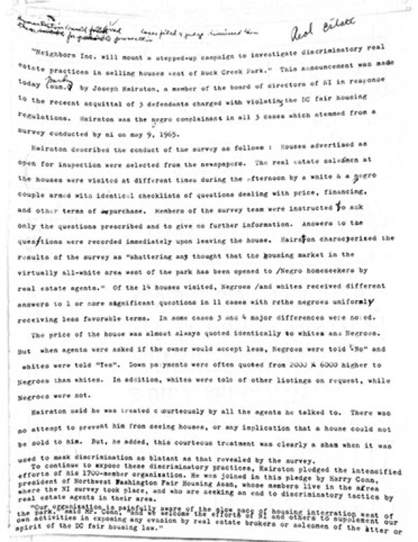 Neighbors, Inc. drafted this report on a May 1965 survey conducted west of Rock Creek Park by white and black couples posing as potential homebuyers. Realtors continued to use racially discriminatory tactics favoring whites by quoting African Americans higher down payments and inflexible pricing terms.