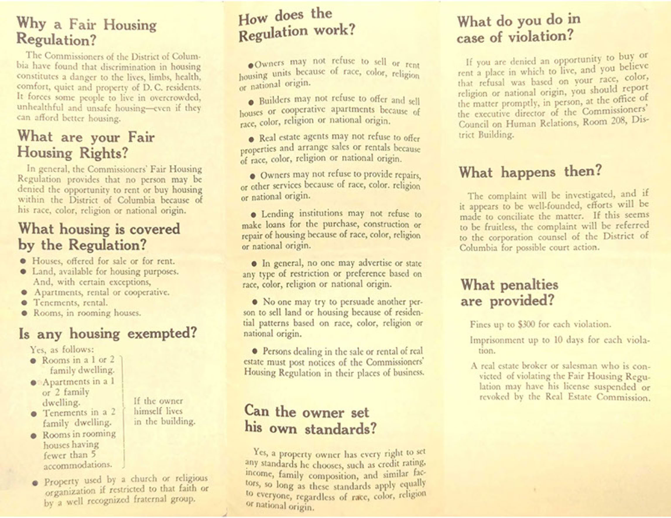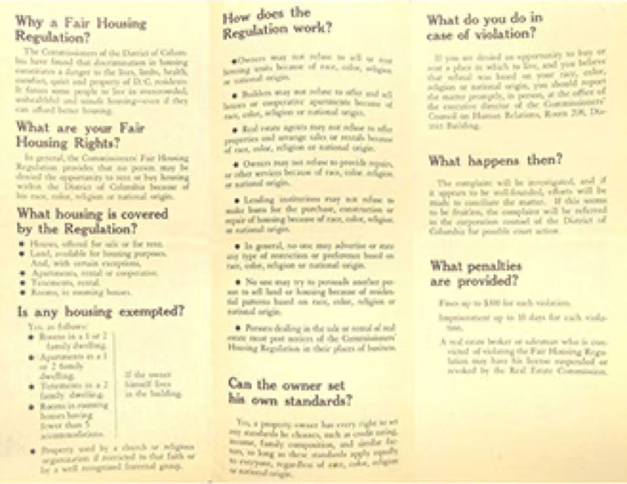 DC's fair housing law took effect on January 20, 1964, and the first complaint was filed five days later. By November 1964, the number of complaints filed in DC (110) was second only to the number filed in New York.
