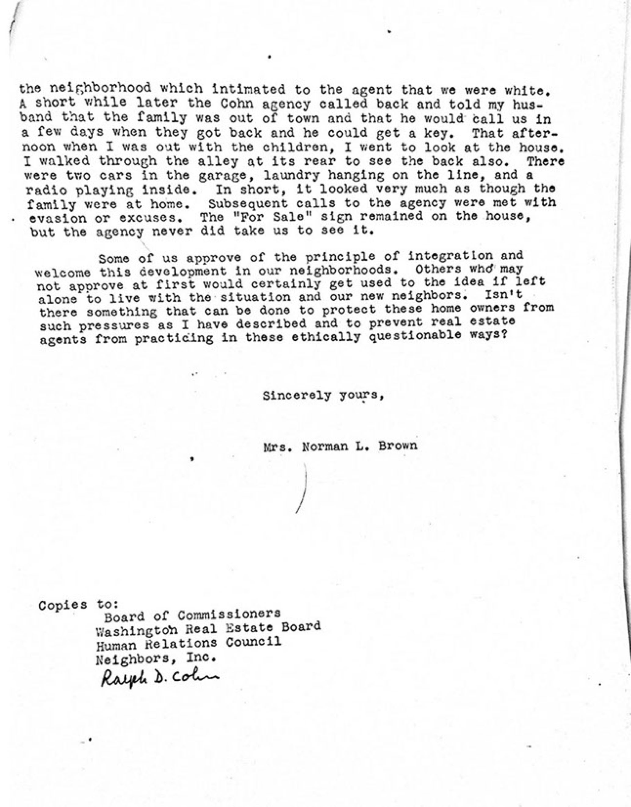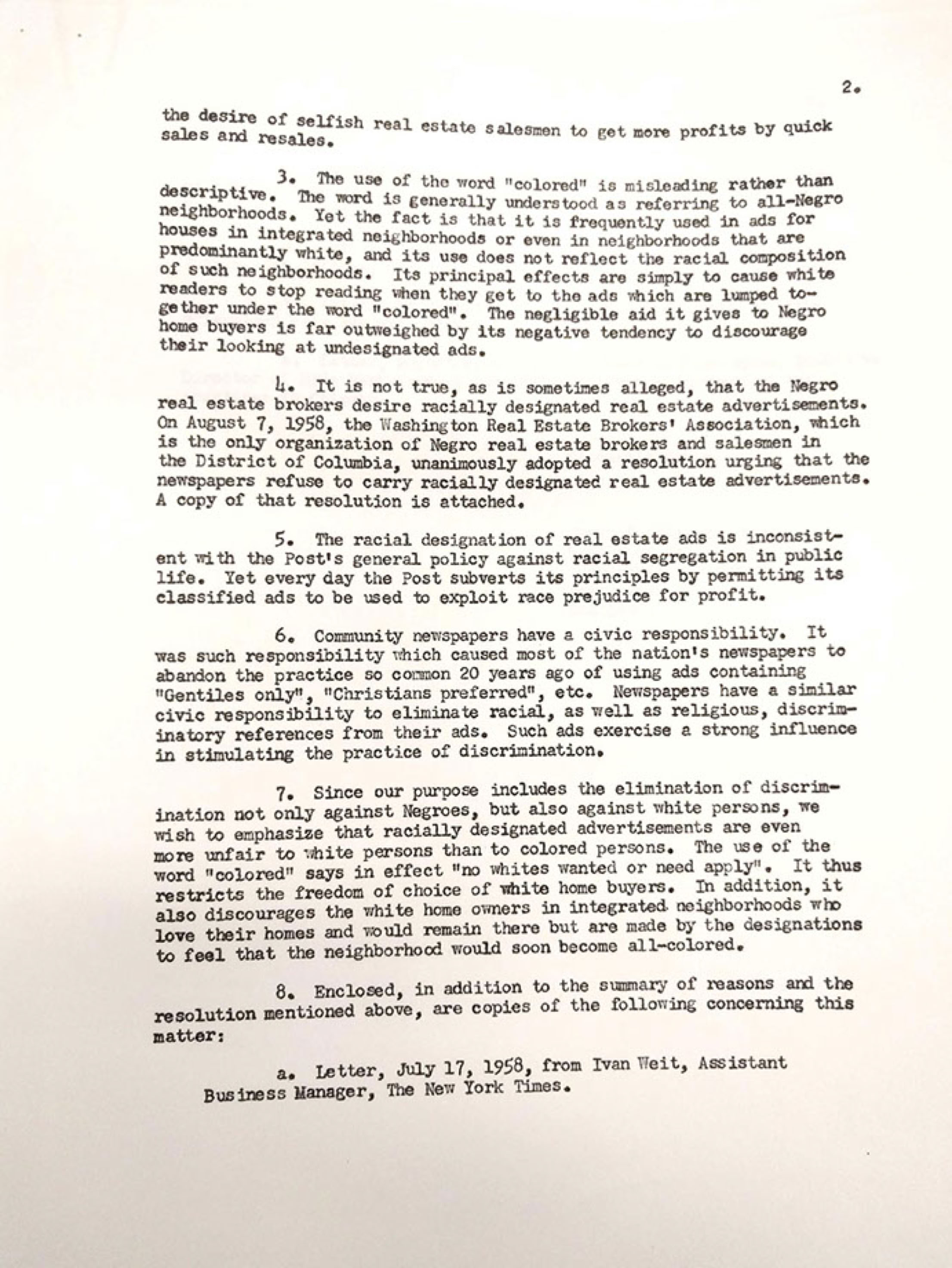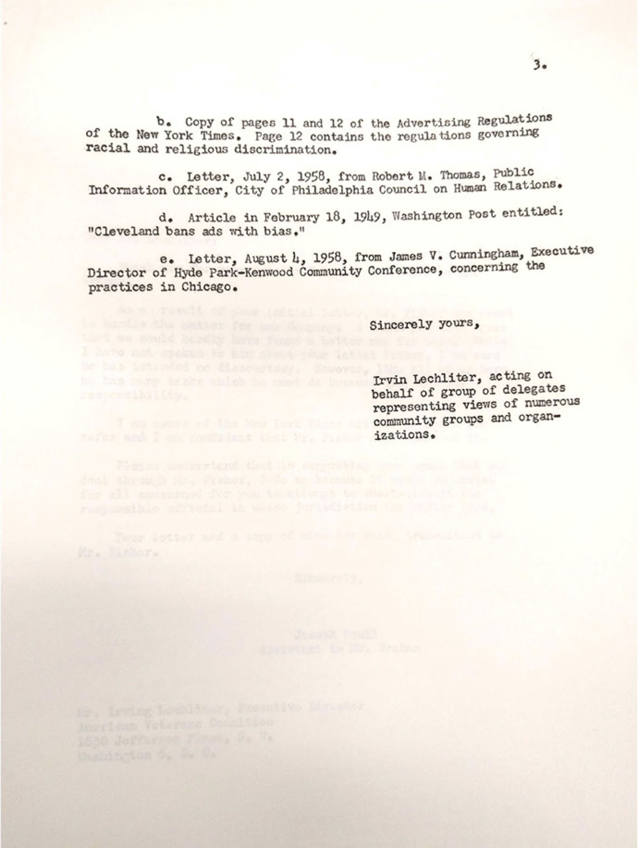 The American Veterans Committee worked to eliminate racial language in newspaper housing ads. DC's daily papers quietly adopted this policy in 1960.