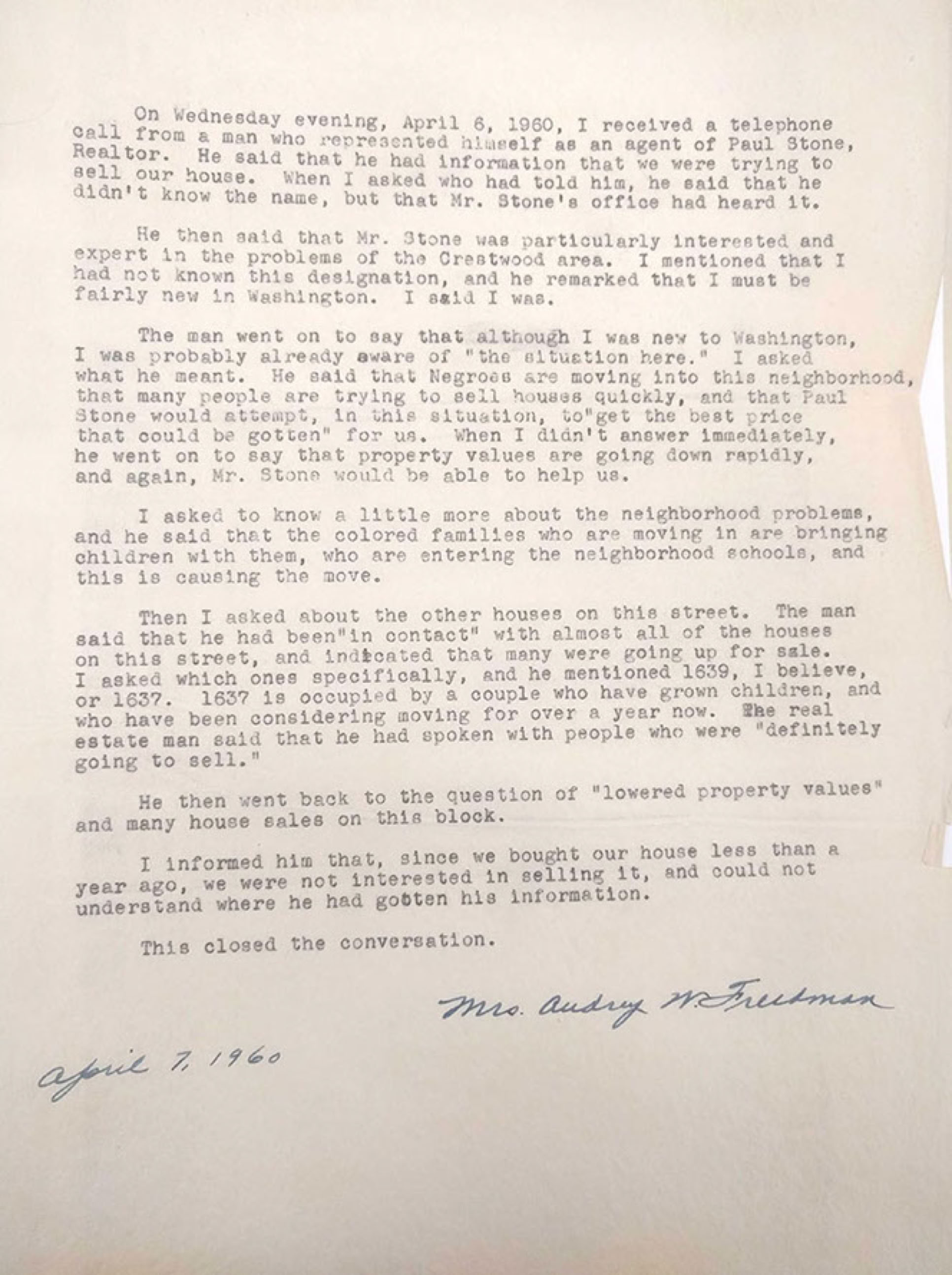 Exhibits submitted by Neighbors, Inc. to the U.S. Commission on Civil Rights in May 1962 included this memo from a Crestwood resident about a call she had received from a Realtor hoping to sell her house.
